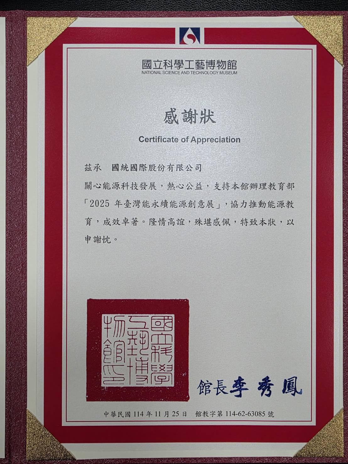 國統國際股份有限公司長期關注水資源與能源議題,今年贊助一套「海水淡化教具」,於高雄國立科學工藝博物館「2025臺灣能—永續能源創意展」中展出,透過互動操作,讓民眾實際體驗從海水變成可利用水資源的過程。