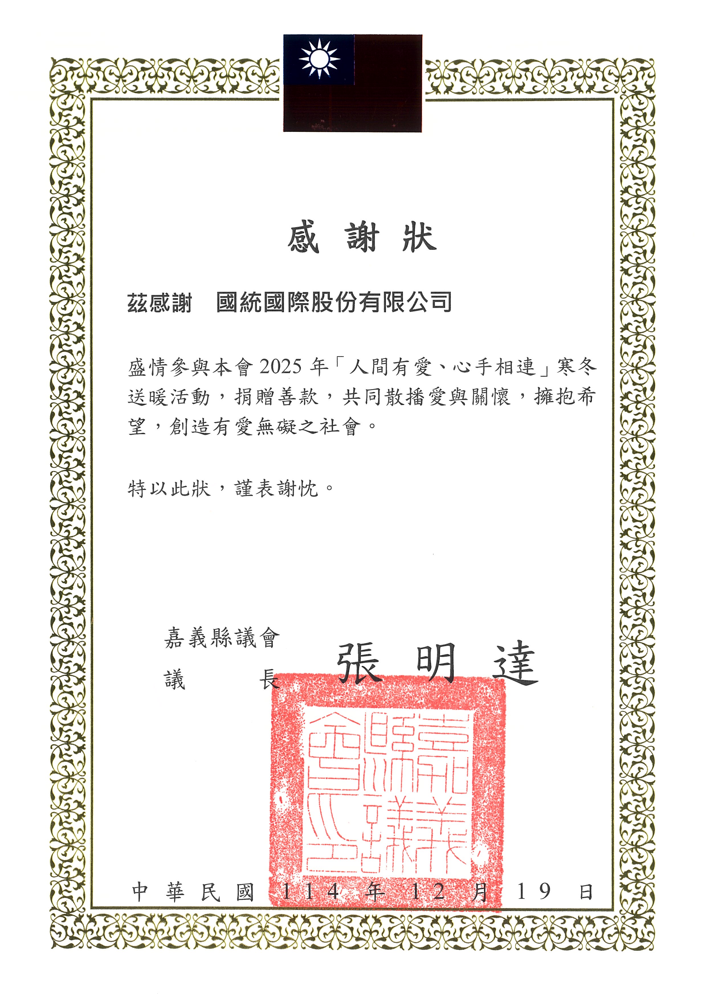 本公司秉持企業社會責任精神,長期關注地方發展與社會公益,於2025年歲末響應嘉義縣議會主辦之「人間有愛、心手相連」寒冬送暖公益活動,透過實際參與與資源支持,關懷弱勢族群需求,傳遞溫暖與希望。