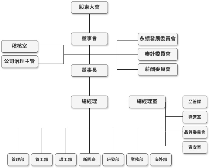 國統公司營運的最高決策組織為董事會,負責擬定公司業務方針以及重要策略,於董事會下設置審計委員會及薪酬委員會,分別協助董事會履行其監督公司在執行有關會計、稽核、財務報導流程及財務控制上的品質和誠信度,以及執行與評估公司整體薪酬與福利政策。