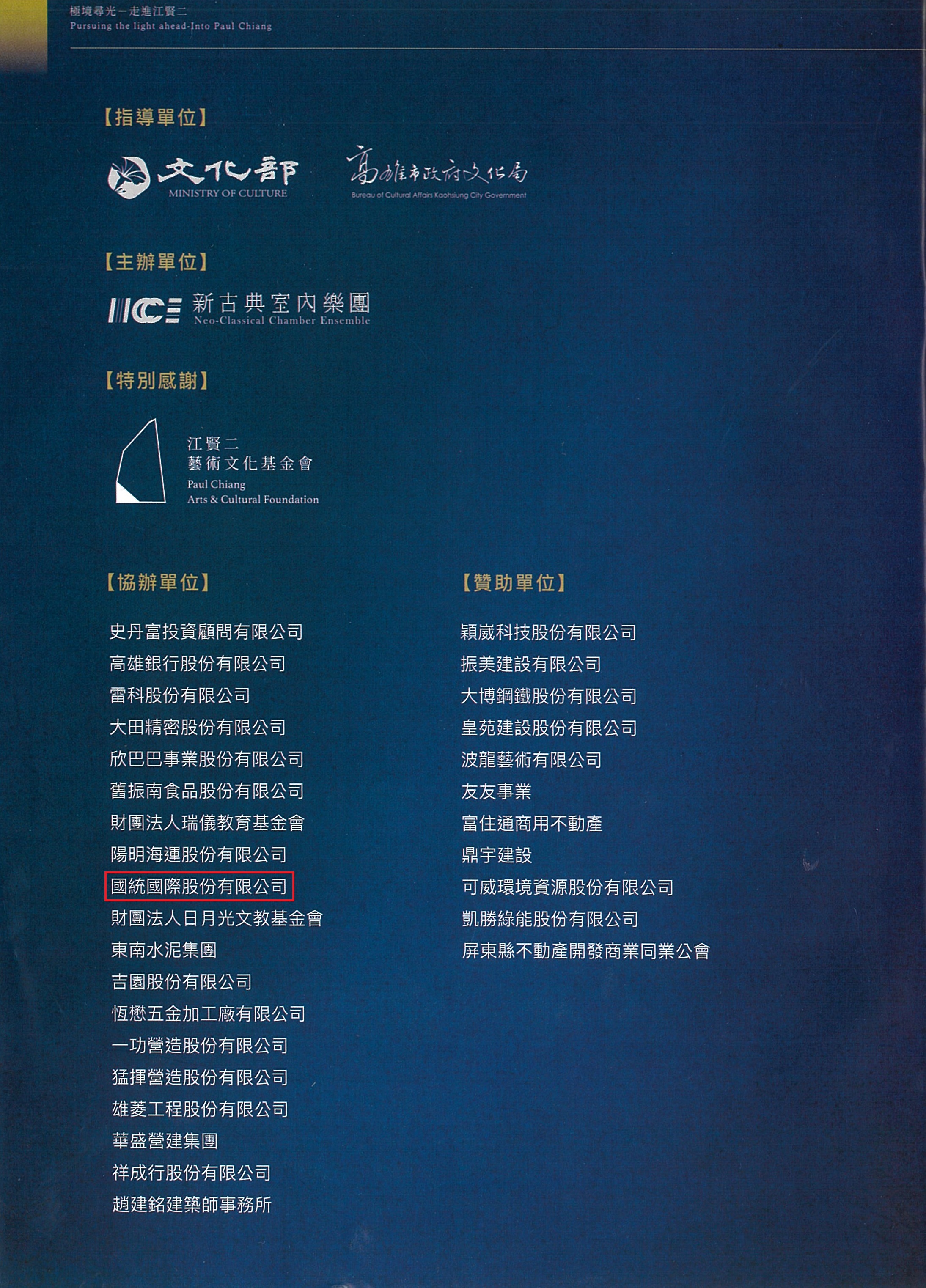 國統國際透過捐助、協辦的方式,積極參與文化藝術活動,並以實際行動支持新古典室內樂團培育在地音樂劇場人才。